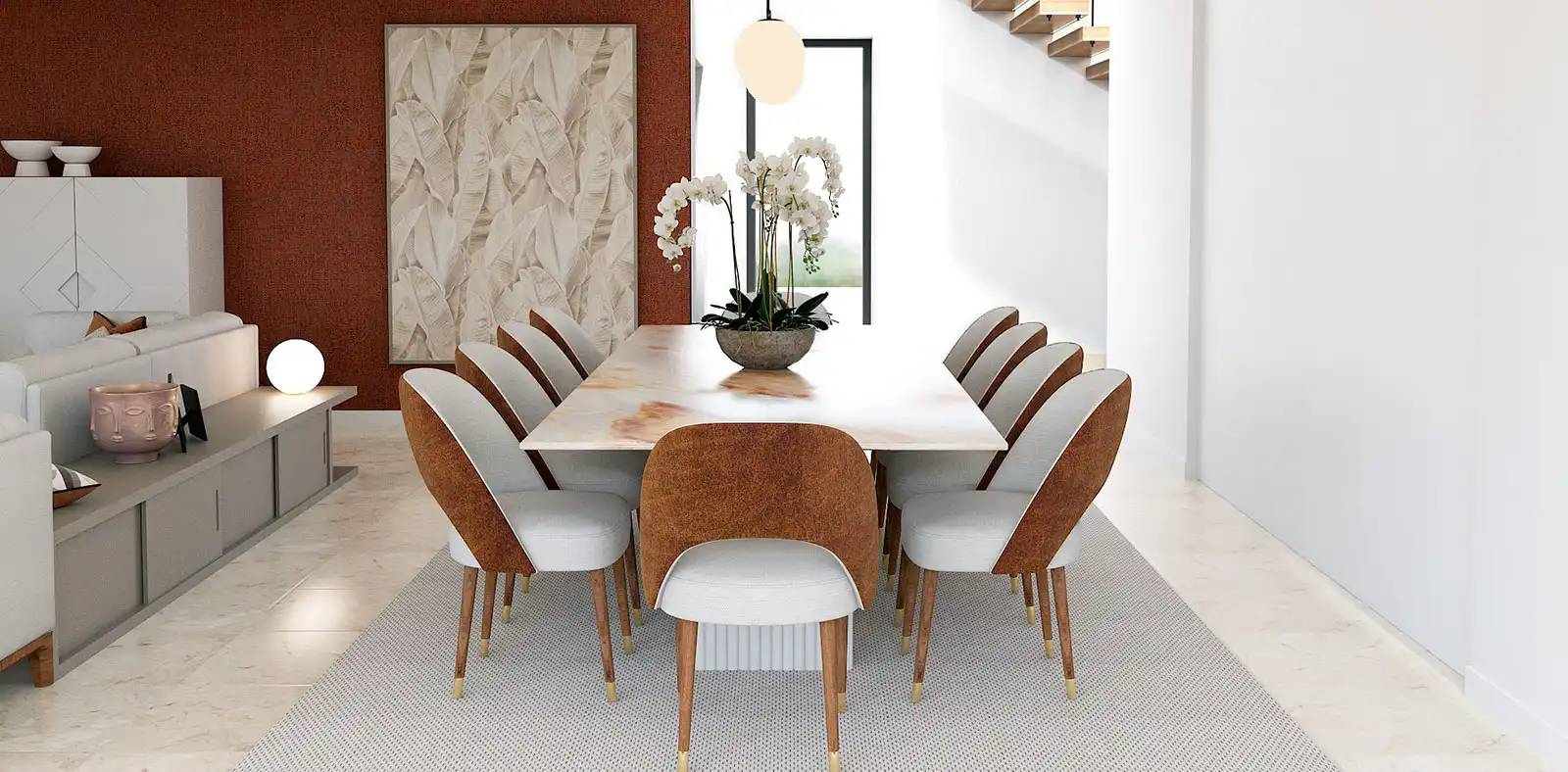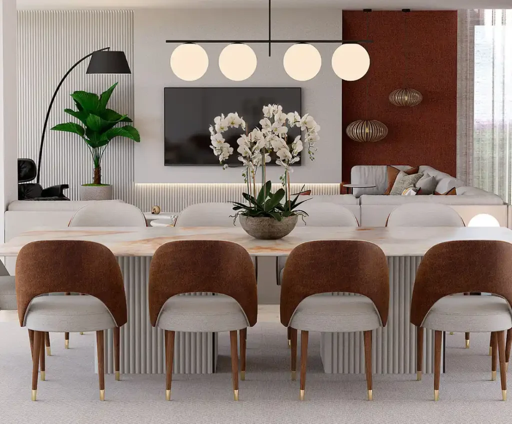 Como toque de elegância, o candeeiro de quatro globos ilumina suavemente quem se senta à mesa e desfruta da atmosfera acolhedora e repleta de charme.