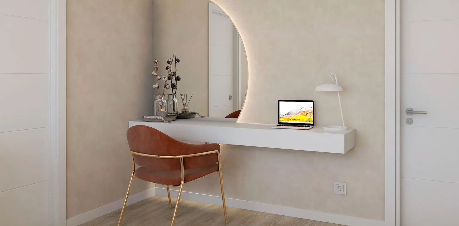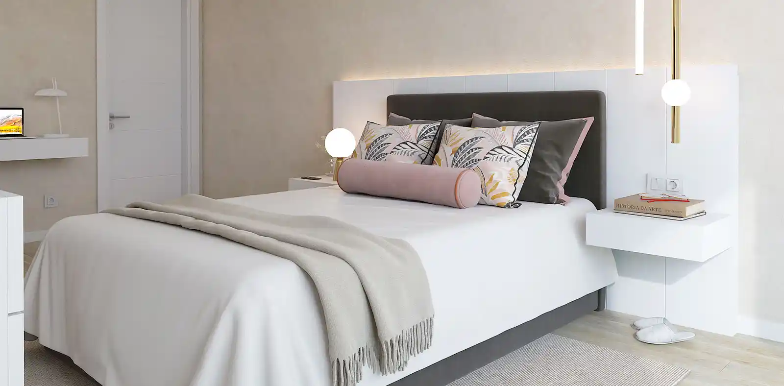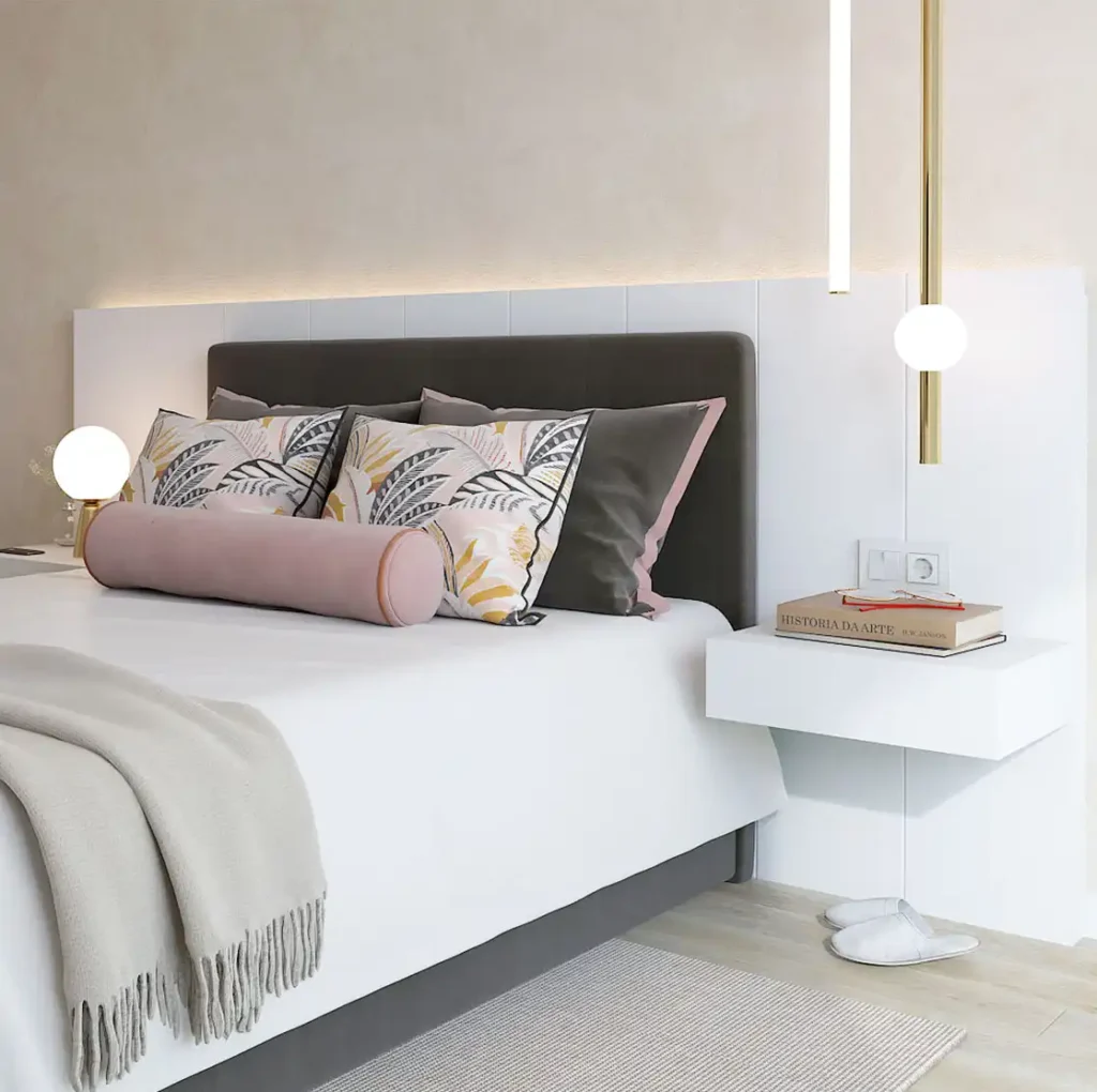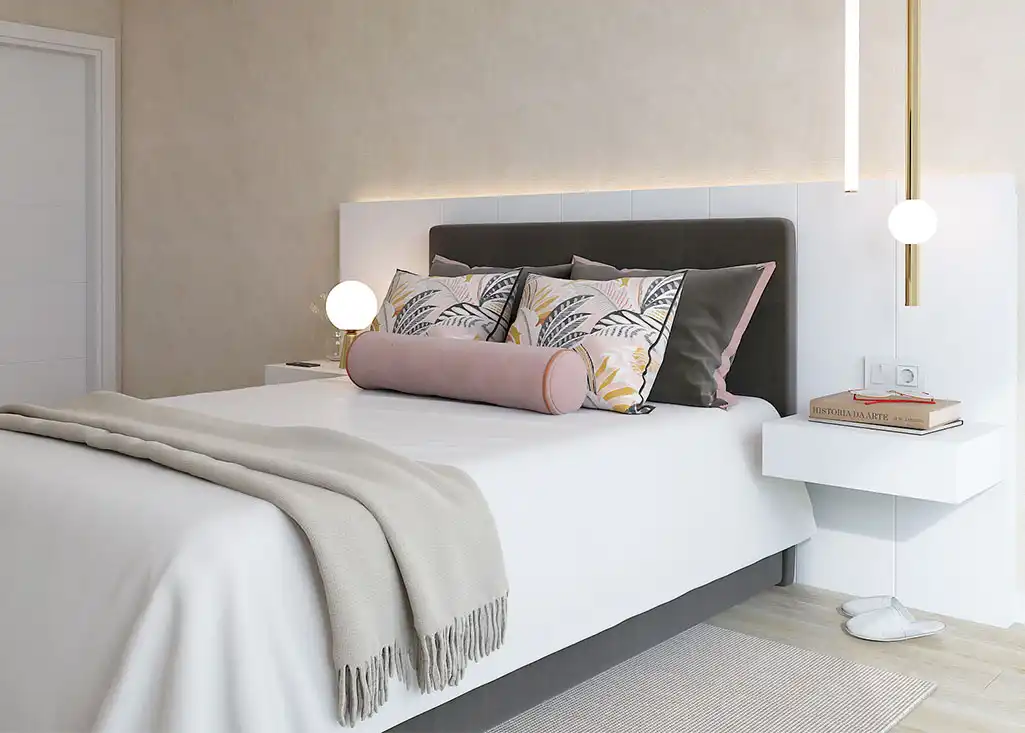 A cómoda, lacada a branco, abre espaço para a arrumação, e o toucador suspenso partilha a sua funcionalidade como uma pequena mesa de trabalho, numa ótica de otimizar o espaço. O espelho retro iluminado, recortado à medida do canto, acrescenta sofisticação e reflete momentos de beleza e relaxamento.