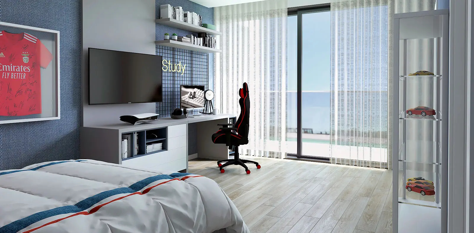 A secretária, com duas prateleiras, permite uma boa organização e aproveitamento de espaço, e o móvel vitrine deixa à descoberta a coleção particular de um jovem sonhador e cheio de paixões.
